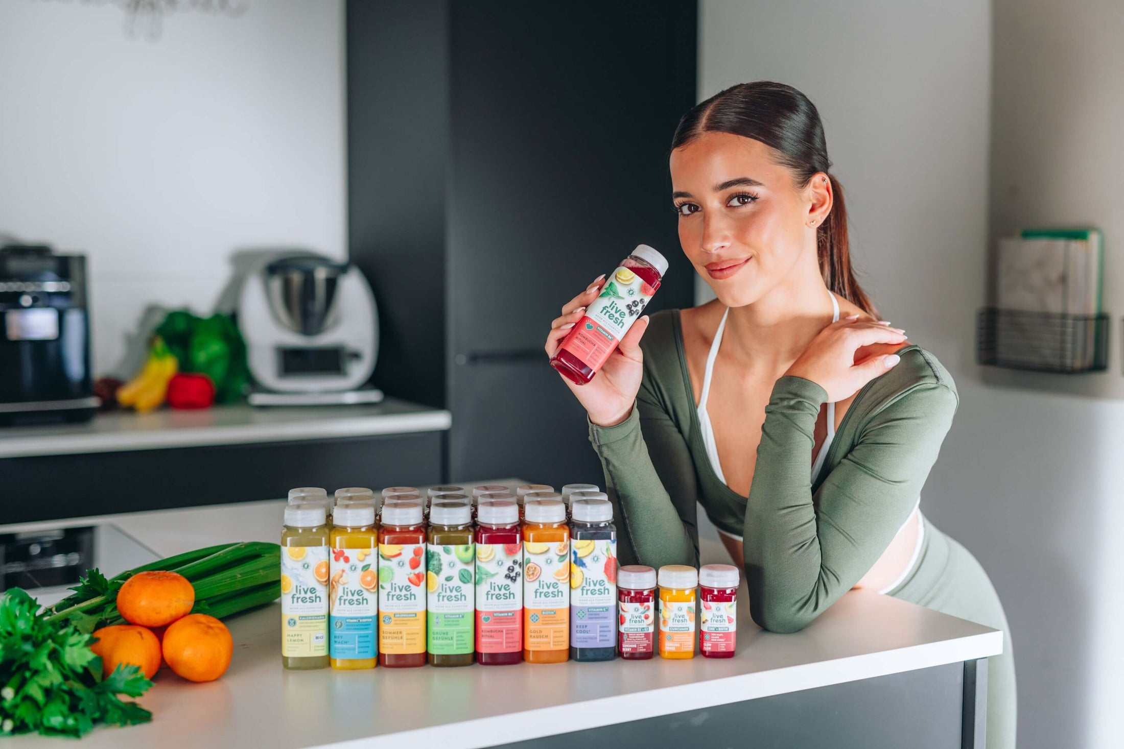 Person hält eine Flasche „Live Fresh“-Saft in der Hand, im Hintergrund stehen weitere bunte Saftflaschen aufgereiht auf einer Theke.