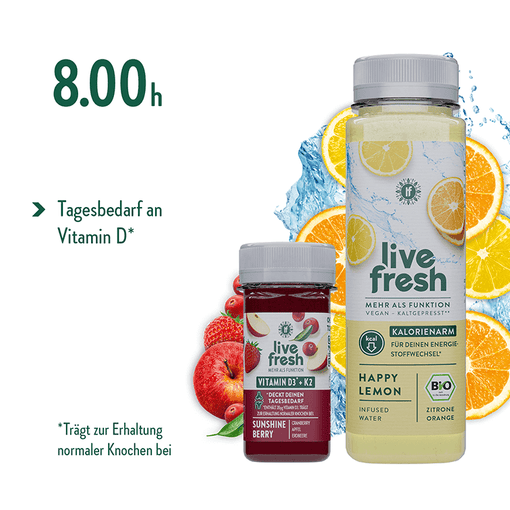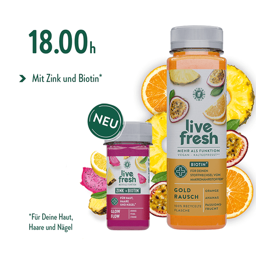 Die Vielfalt an verschiedenen Säften garantiert, dass für jeden etwas Passendes dabei ist. Insgesamt stehen jeden Tag 7 Säfte und 3 Shots zur Verfügung, die in einem Intervall von zwei Stunden getrunken werden. Die Zutaten sind dabei ideal auf den Resetdes Körpers abgestimmt, sodass eine ausreichende Vitamin- und Nährstoffversorgung gewährleistet wird. Egal ob Du Dich für eine 3-Tage, 5-Tage oder 7-Tage Saftkur entscheidest – in dieser Zeit des Fastens trinkst du nur die LiveFresh Säfte aus Obst und Gemüse und verzichtest ganz bewusst auf feste Nahrung.